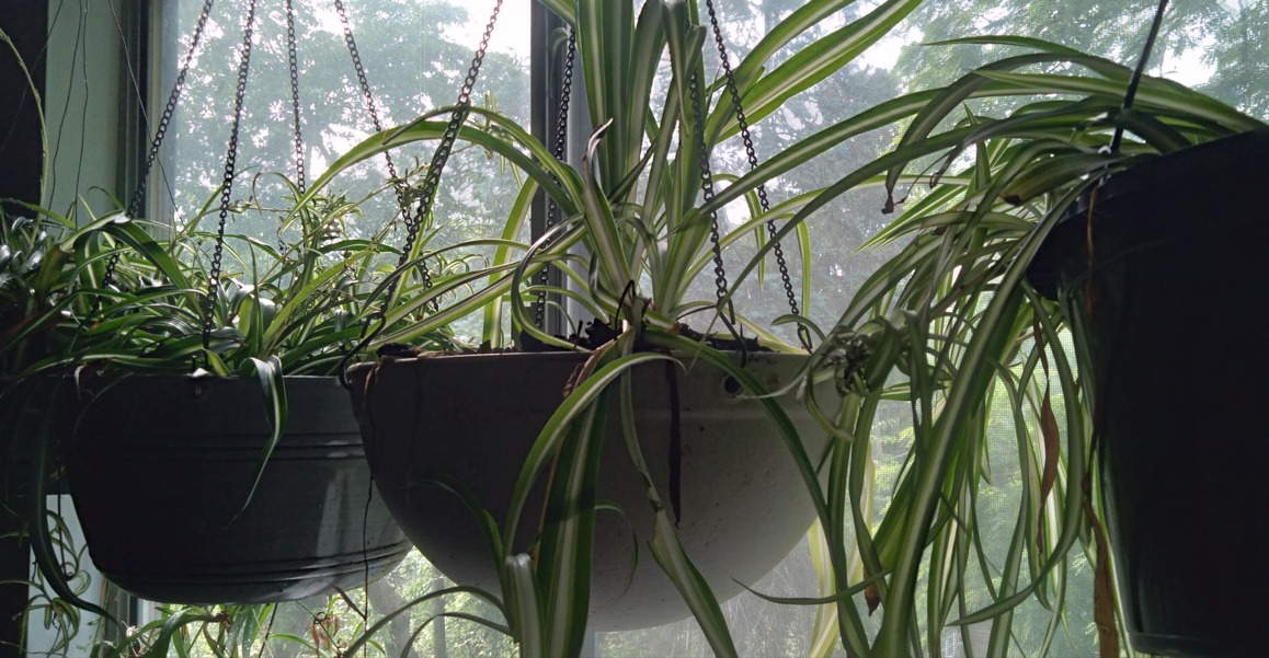 As part of the long-term breathing experiment we have cultivated multiple generations of spider plants. They are a great place for a novice to get started. Spider plants thrive in bright to moderate light. In the spring and summer, once-a-week watering is sufficient. During the winter, the soil should dry between waterings. (Spider plants are almost as easy to care for as cacti.) Snake plants are also easy to grow in all kinds of lighting situations, require little watering, and are one of the best air purifying plants.